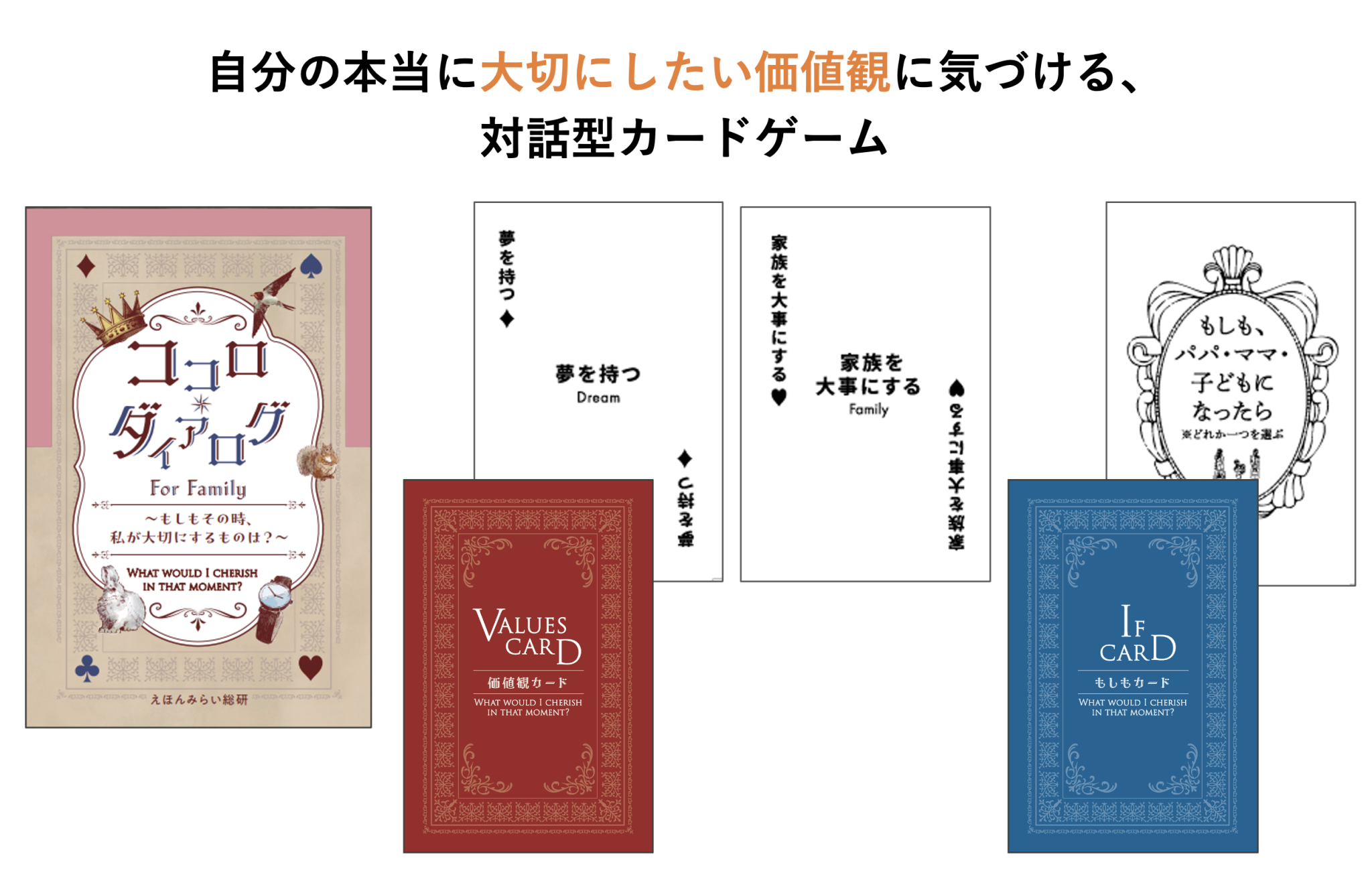 絵本未来創造機構が開発した、カードゲームで楽しく大切にしたい価値観を発見・探求できる対話ツールです。44枚の「価値観カード」で大切にしたい価値観を探り、家族みんなで共有し合うことで自己理解・相互理解を深めます。